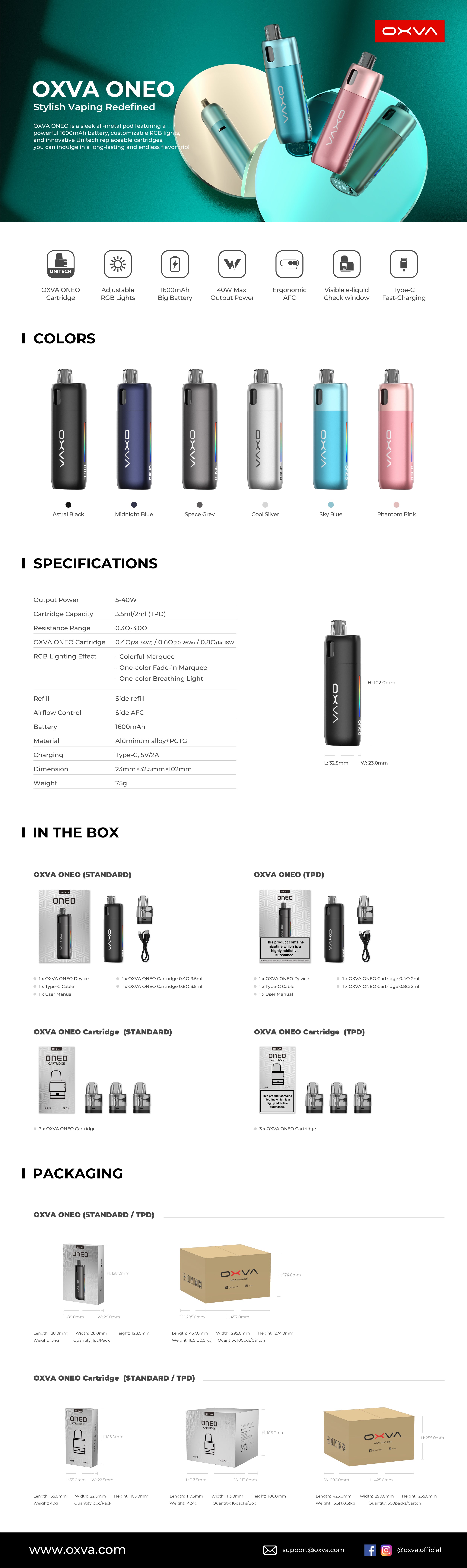Experience endless flavor with the Oxva Oneo Pod Kit - a solid and robust vaping kit with a huge 1600 mAh battery and customizable RGB lighting. Take control of your vaping experience with ergonomic airflow technology.
